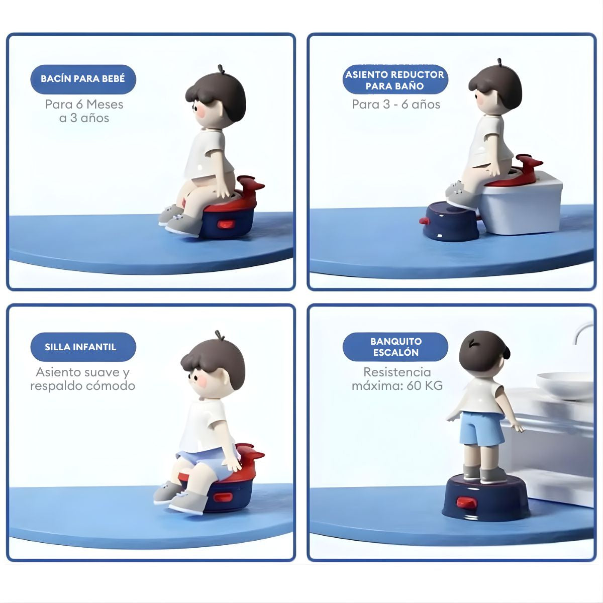 - Banquito / escalón: La base funciona como escalón para que el niño suba al inodoro o alcance el lavadero.