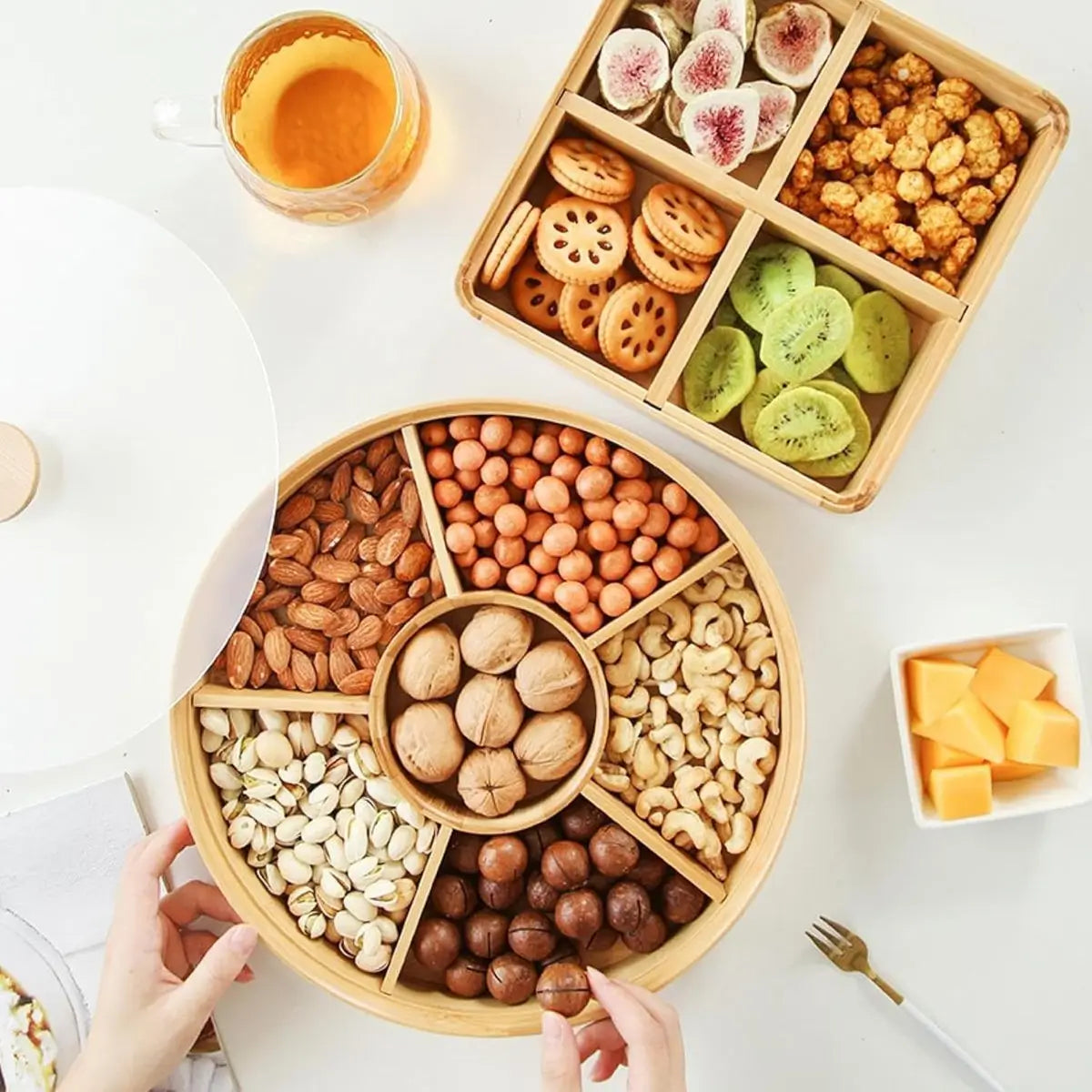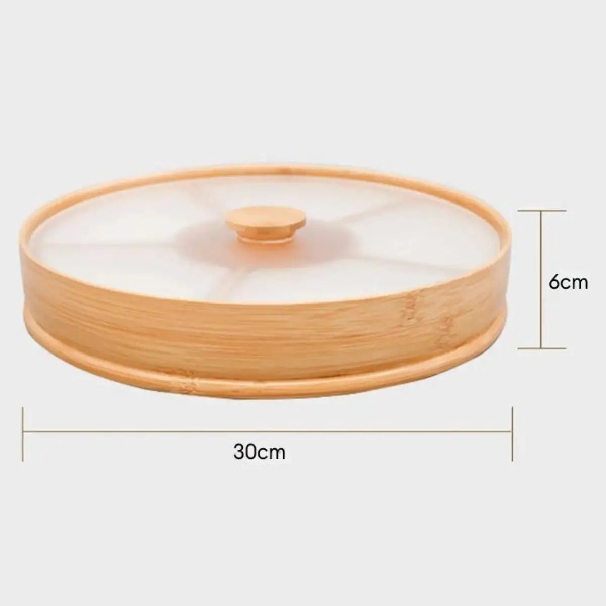 - Diseño: Redondo con 5 divisiones internas para snacks, frutos secos, dulces, accesorios u organización.