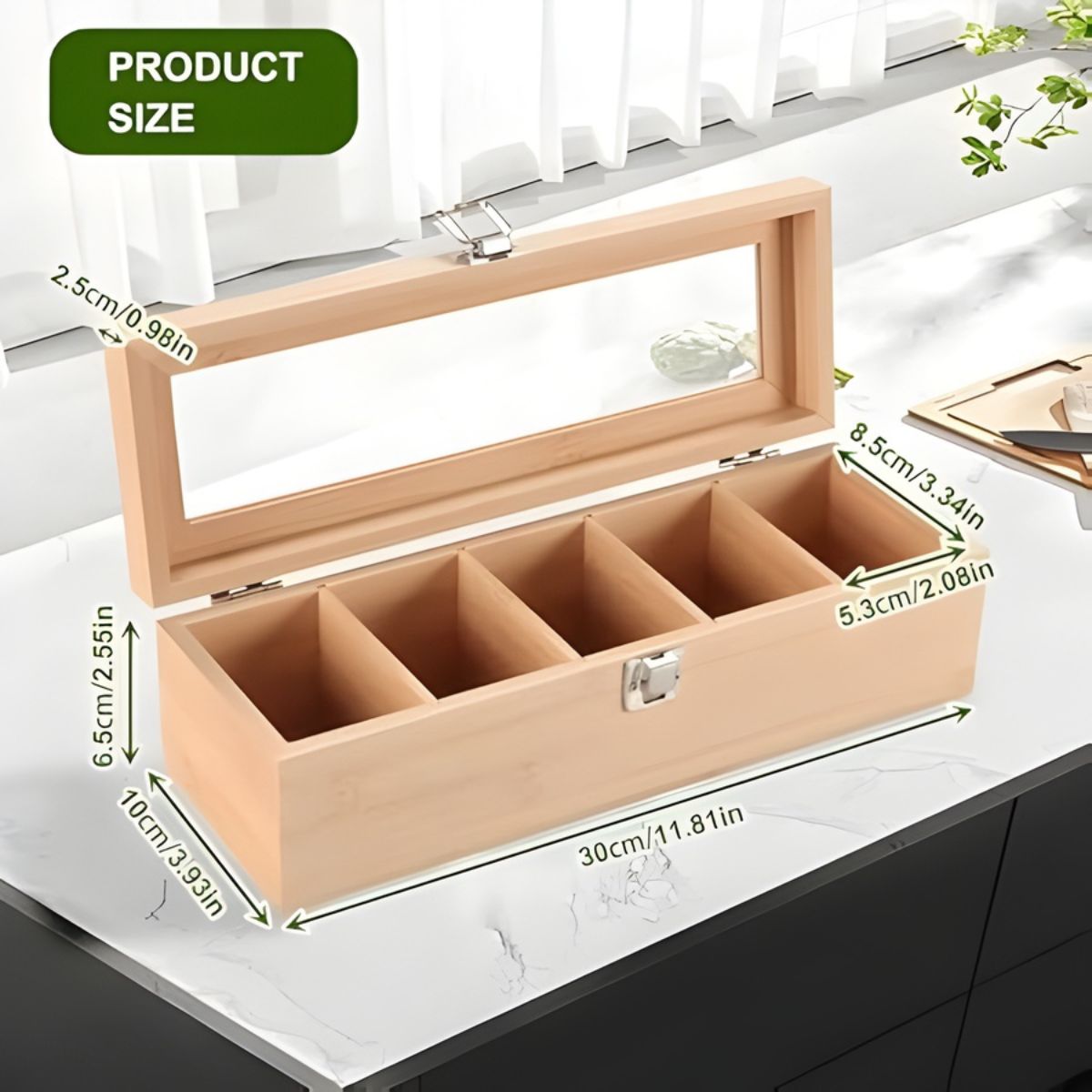 Cuenta con 5 compartimentos internos que te ayudan a separar diferentes sabores de té, infusiones, azúcar o pequeños accesorios. Además, sus divisiones pueden retirarse si deseas adaptar el espacio según tus necesidades.