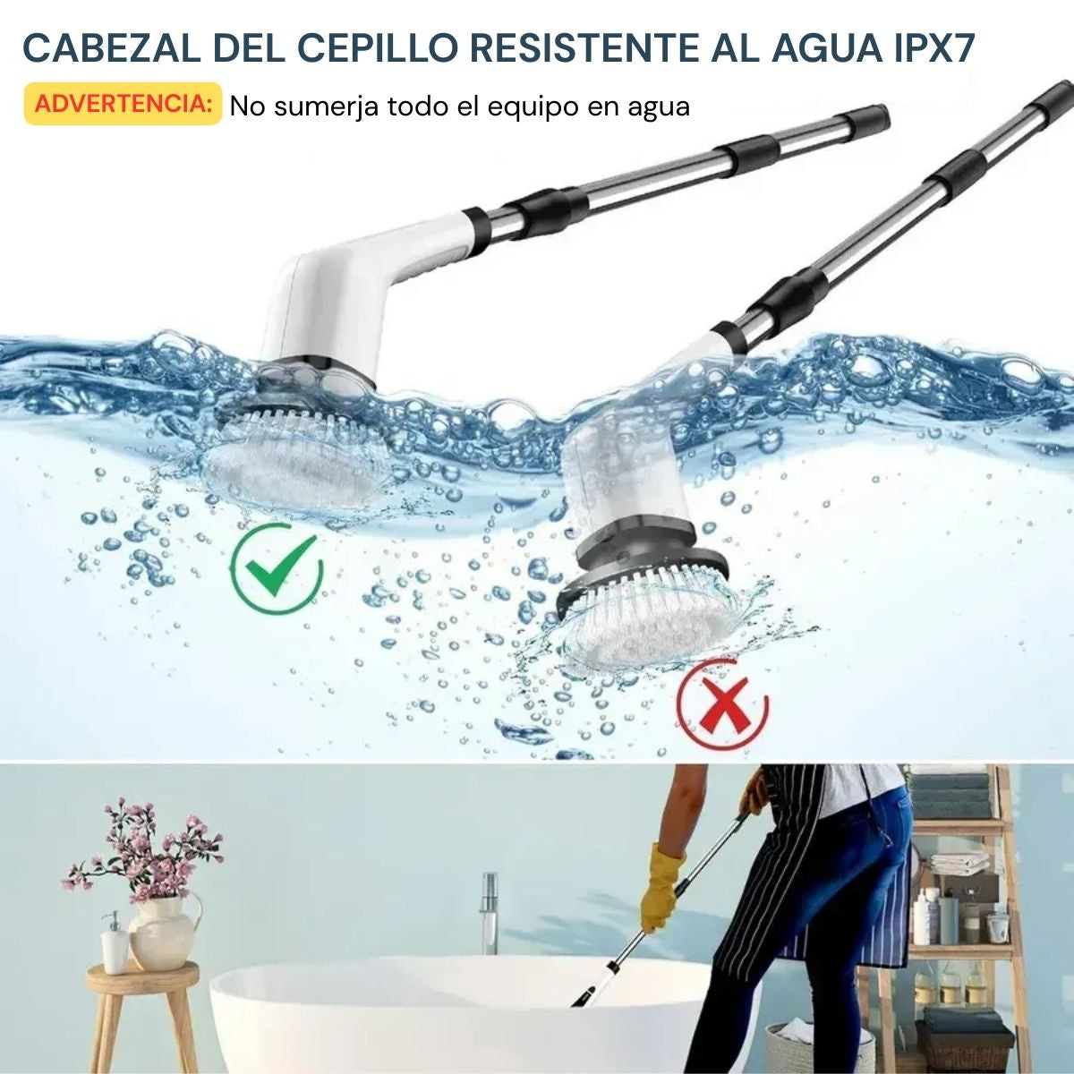 No se debe sumergir todo el equipo en agua - Uso recomendado en baño, cocina, pisos, lavaderos, esquinas y superficies difíciles