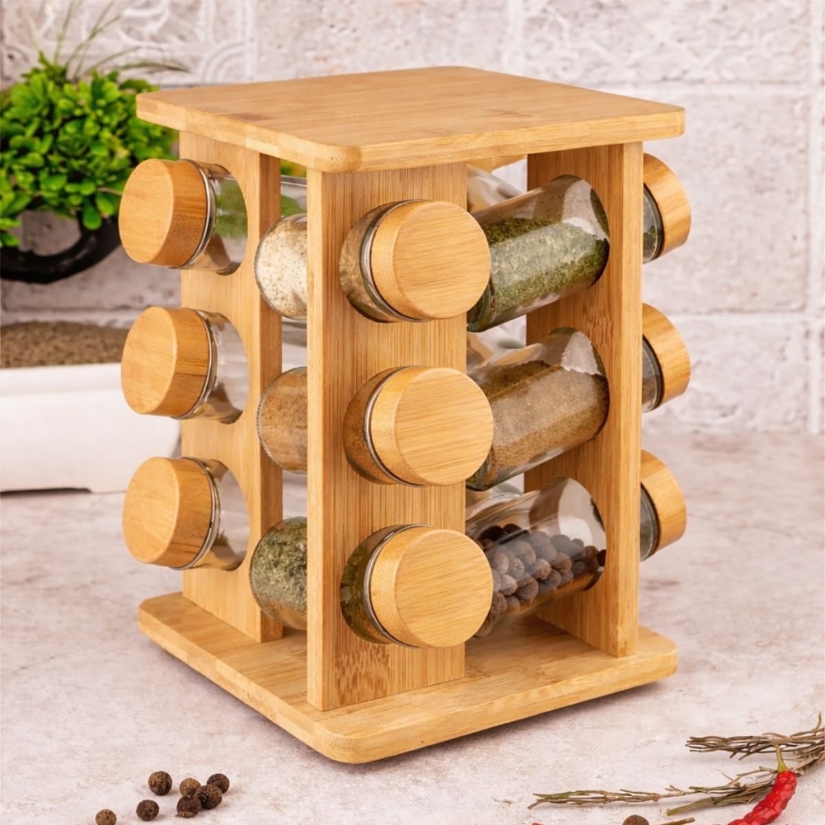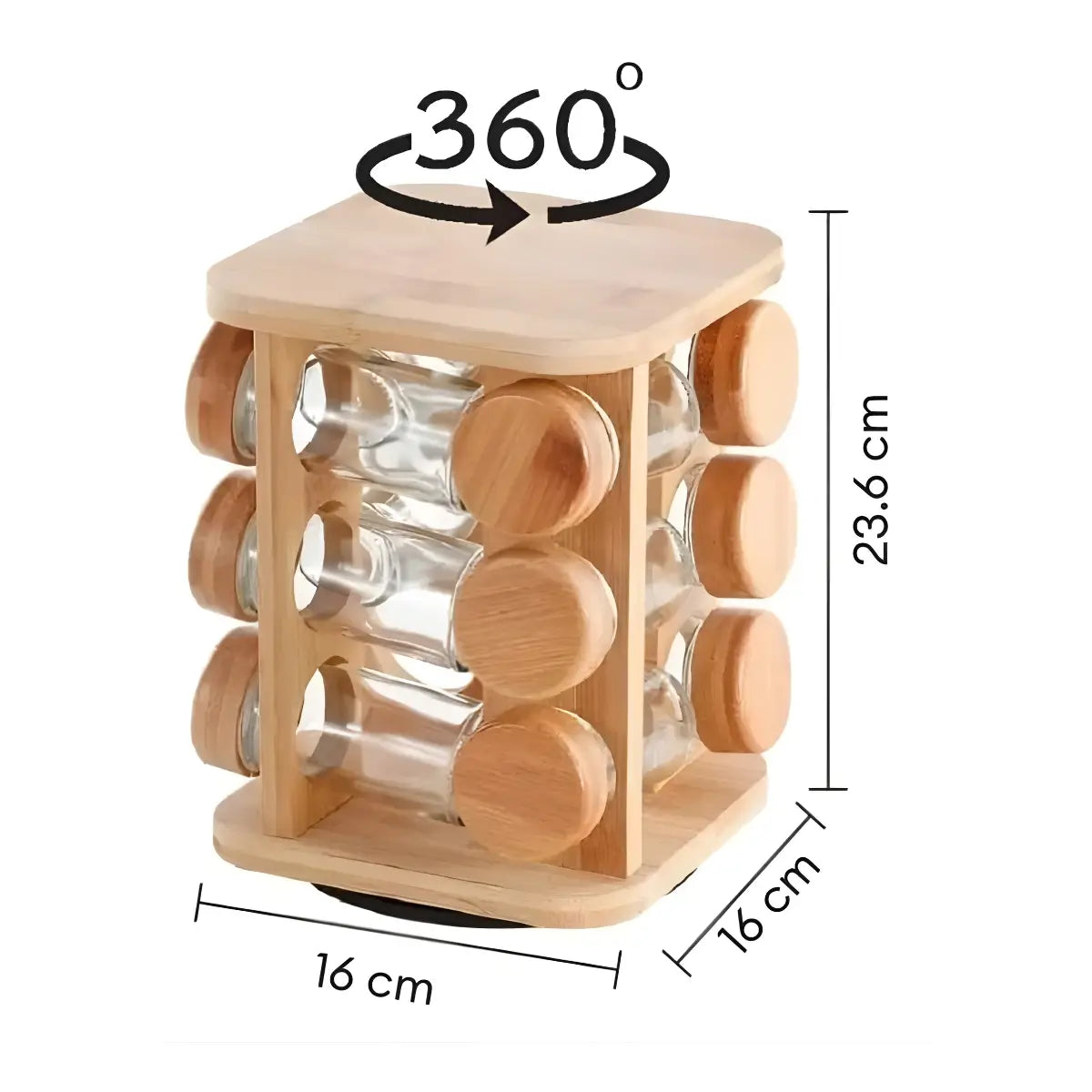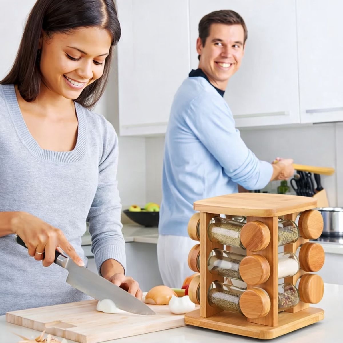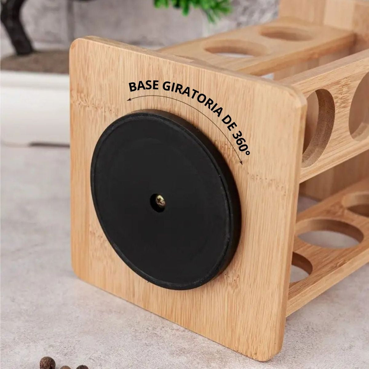 Mantén tus condimentos siempre a la mano y tu cocina impecable con este elegante organizador giratorio de bambú. Su diseño vertical y compacto ahorra espacio, mientras que su base 360° te permite acceder fácilmente a todas tus especias con un solo giro.