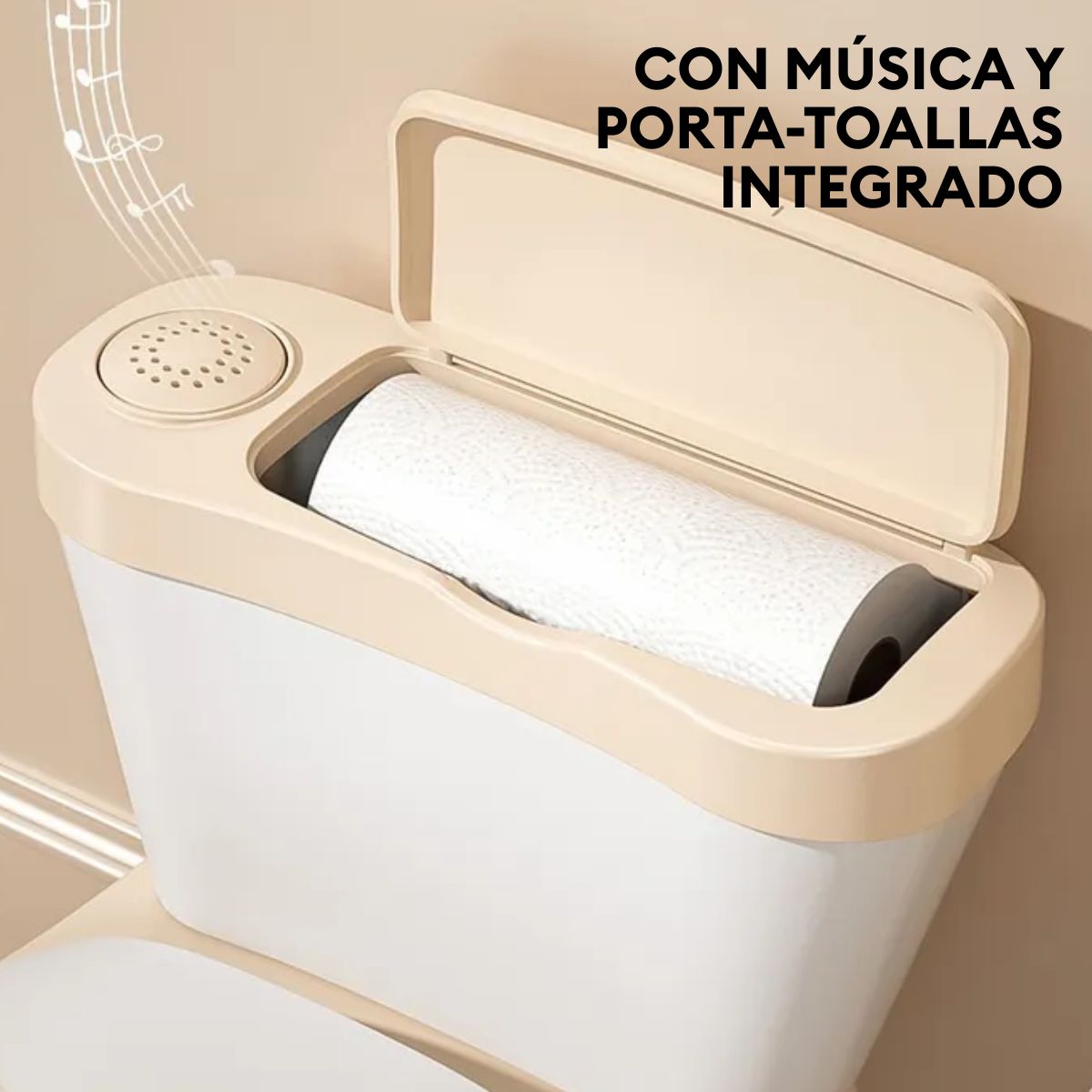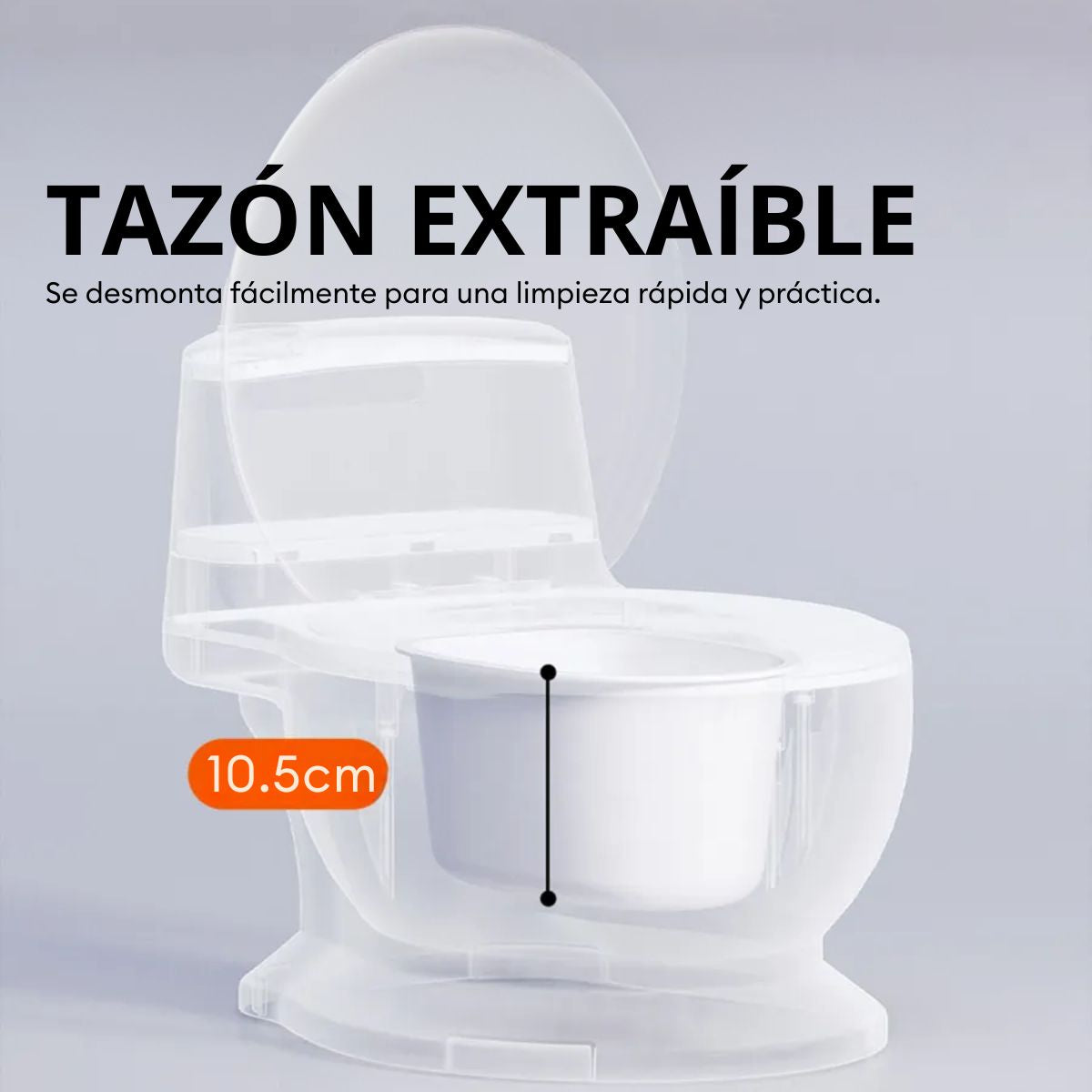 Funciones: simula un inodoro real, depósito extraíble para limpieza rápida, tanque con sonido tipo descarga, base firme para mayor estabilidad, compartimento lateral para papel o toallitas, tapa abatible.