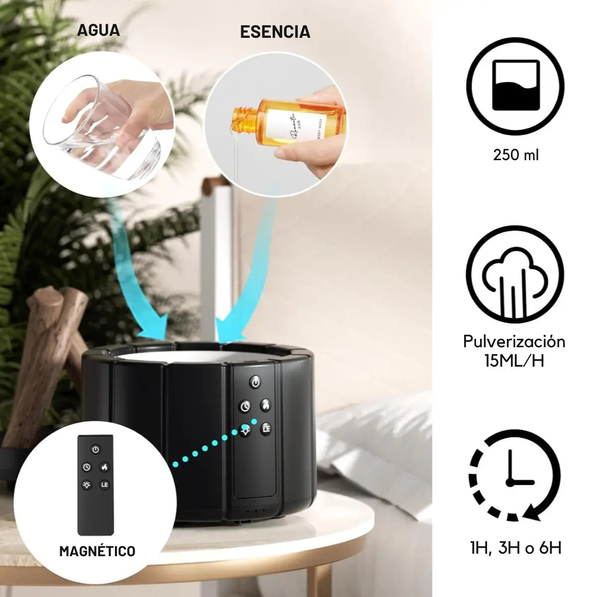 - Temporizador ajustable de 1, 3 y 6 horas