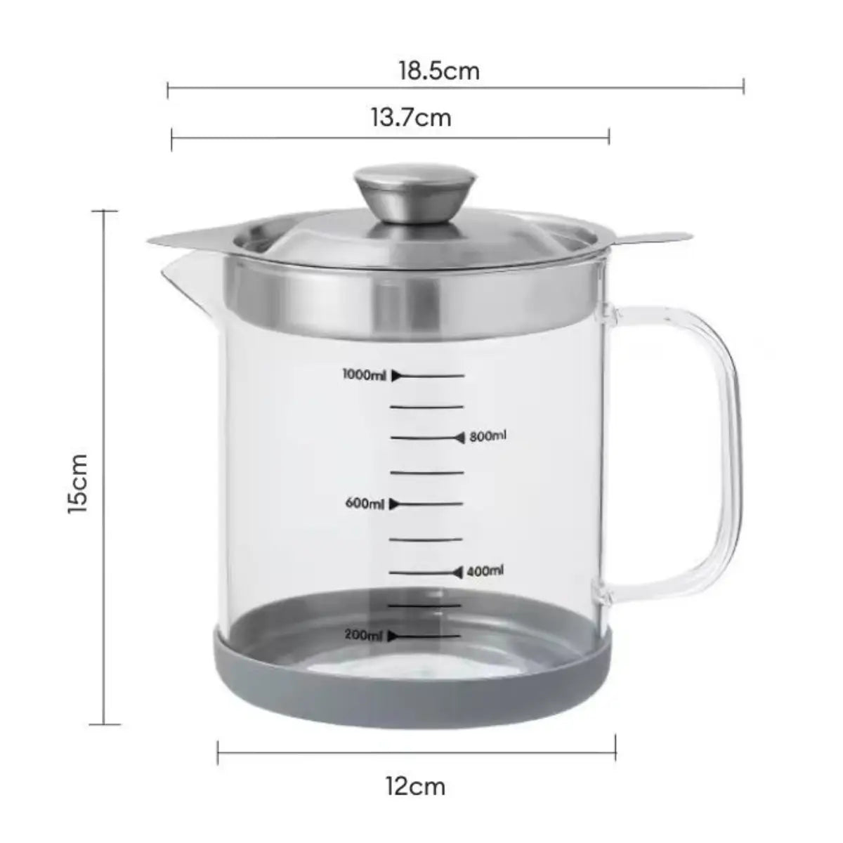 Organice y reutilice su aceite de manera práctica y segura con esta jarra aceitera de 1 litro, resistente al calor, diseñada especialmente para separar residuos y conservar sus líquidos calientes sin complicaciones. Su capacidad real de 1000 ml, con marca visible desde 200 ml, le permite medir con precisión y controlar mejor sus preparaciones