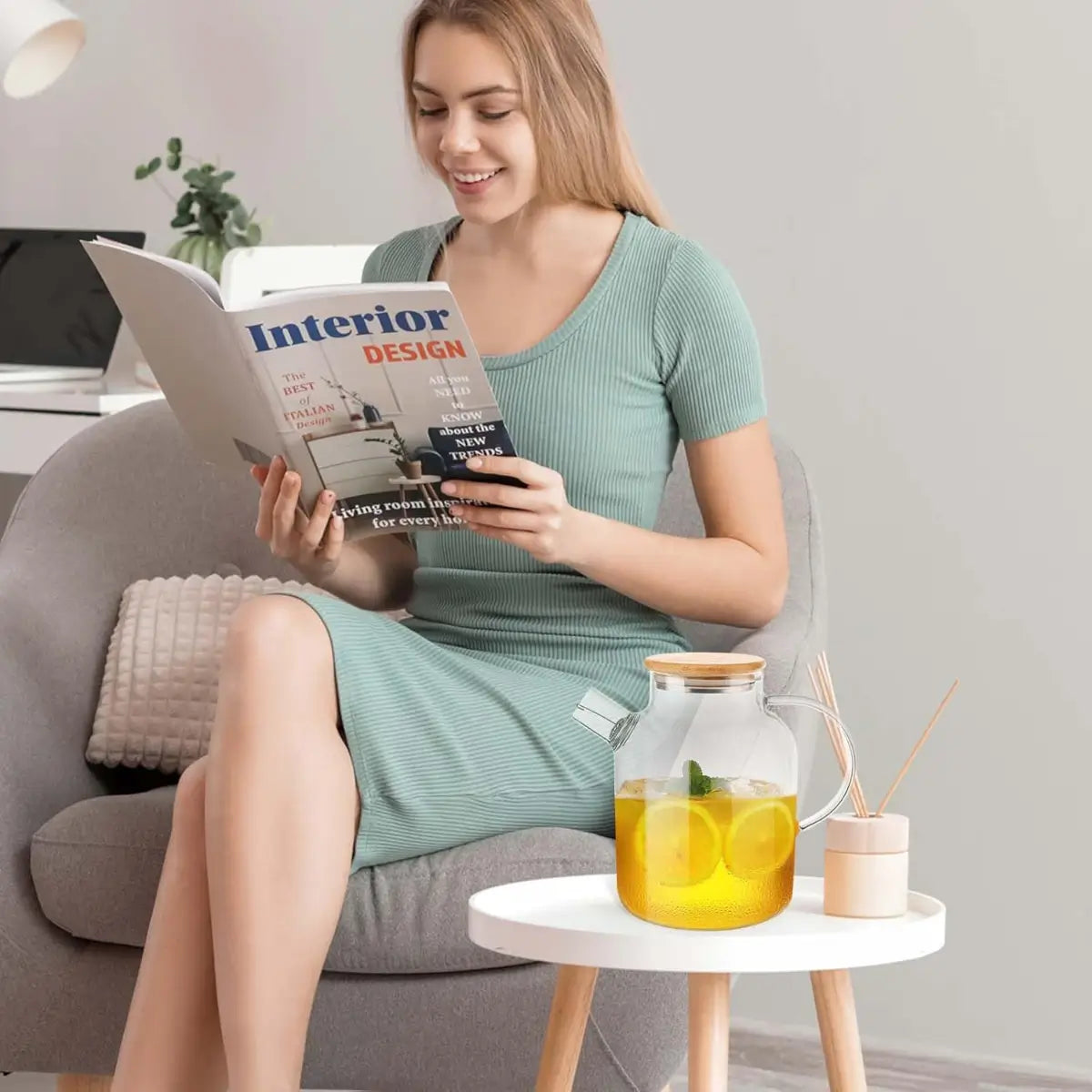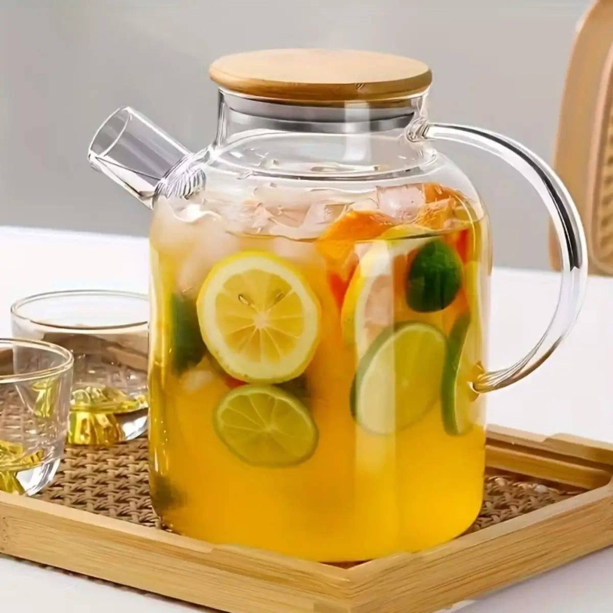 Haz que tu cocina luzca más elegante mientras disfrutas tus bebidas favoritas con esta Tetera de vidrio borosilicato, diseñada para mujeres que aman engreír su hogar con detalles prácticos y hermosos. Su diseño minimalista con tapa de bambú combina con cualquier estilo y convierte cada bebida en un momento especial, ya sea un té caliente por la mañana o un refresco helado en la tarde.