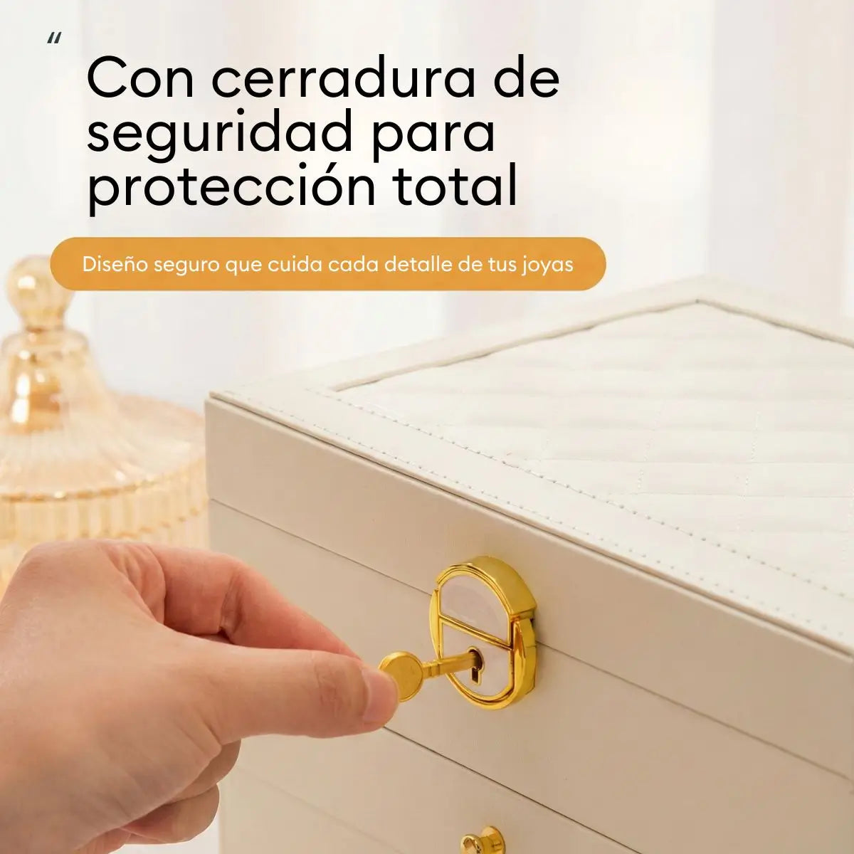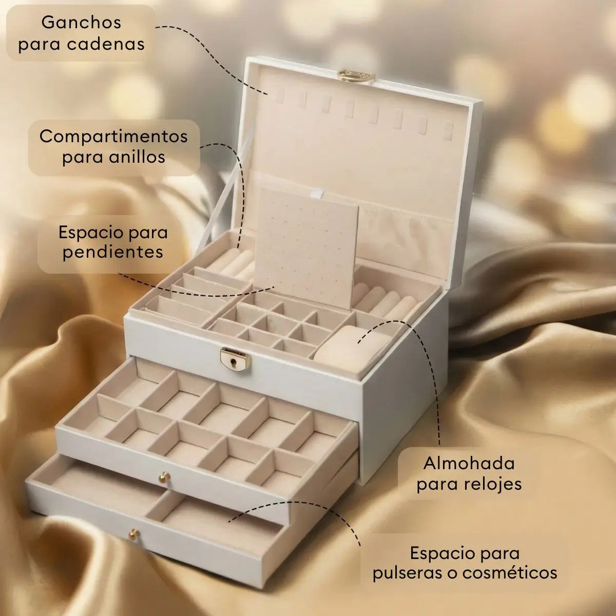 - Organización: compartimentos para anillos, collares, pulseras, aretes y relojes