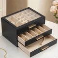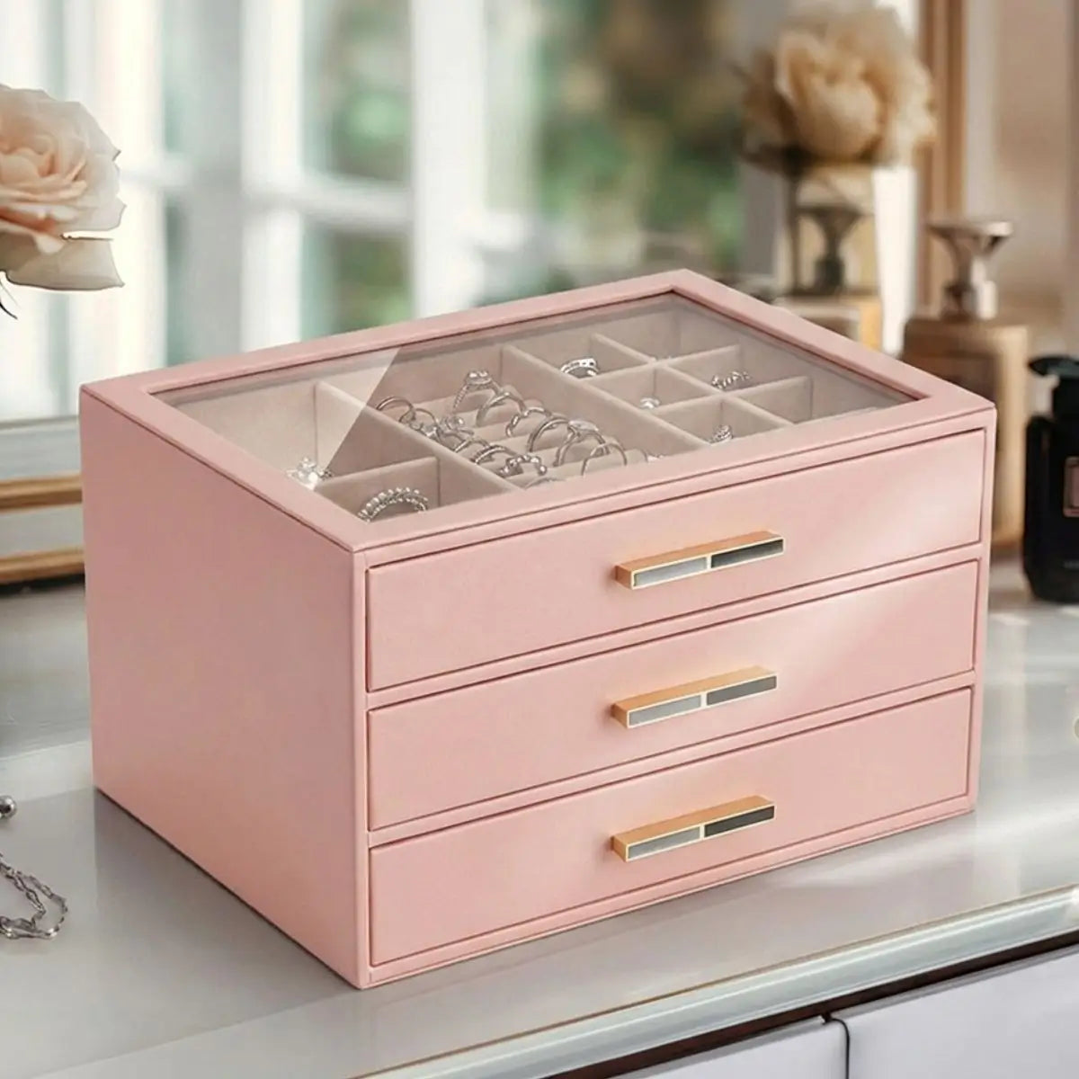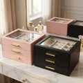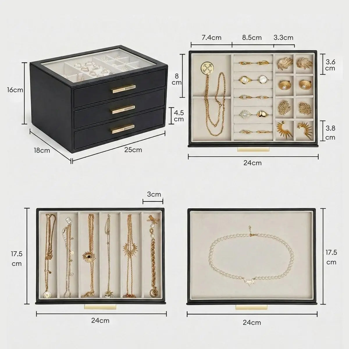 Este organizador de joyas está diseñado para mantener tus accesorios siempre ordenados, visibles y protegidos. Su tapa de vidrio transparente permite ver el contenido de un vistazo sin necesidad de abrirlo, facilitando el acceso rápido a tus piezas favoritas.
