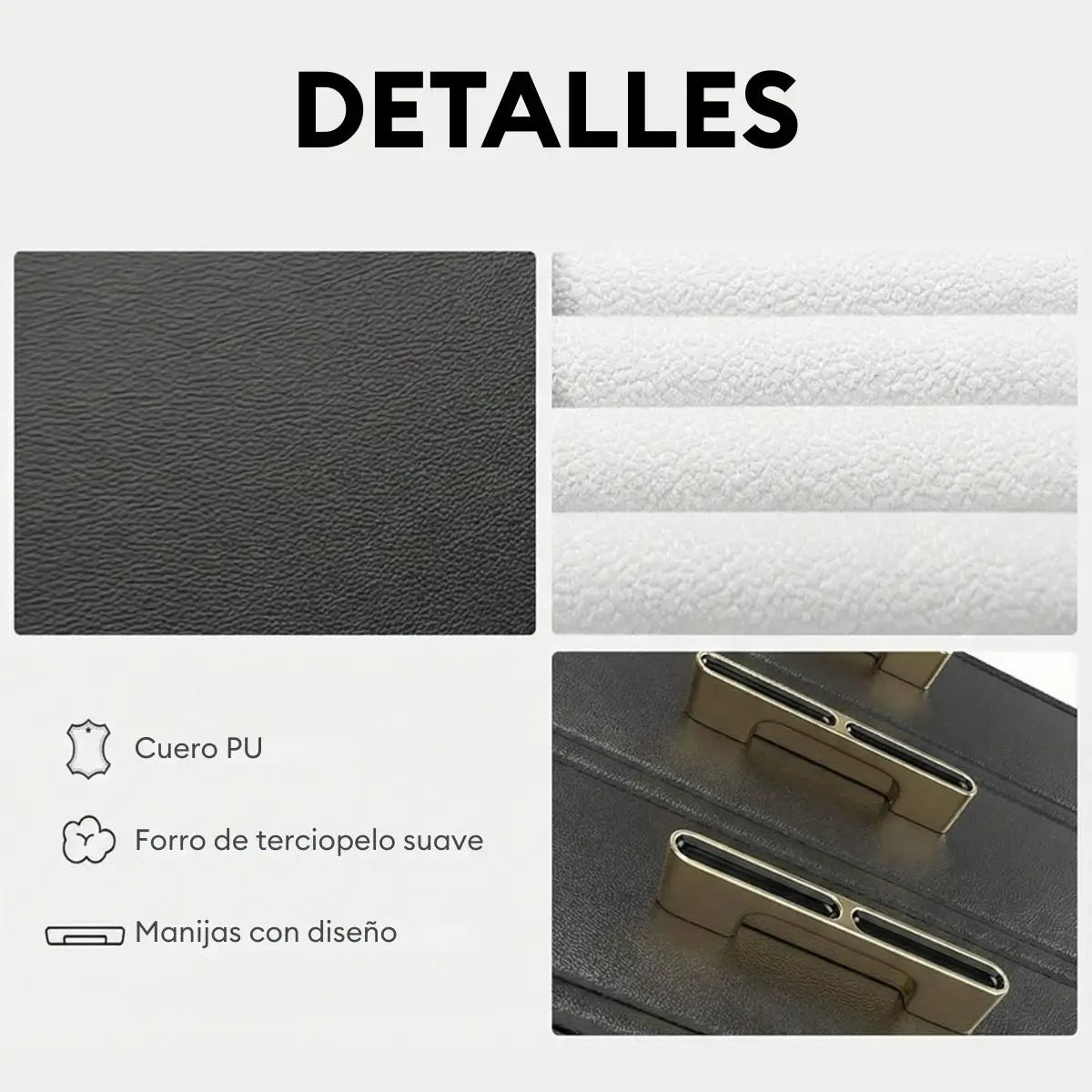 - Material: Cuero sintético (PU), interior de terciopelo, estructura de MDF y tapa de vidrio.