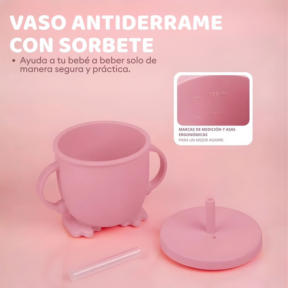 - Vaso antiderrame de 150 ml con tapa y pajita