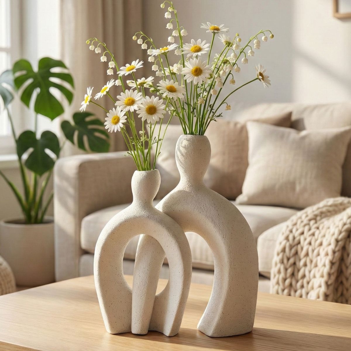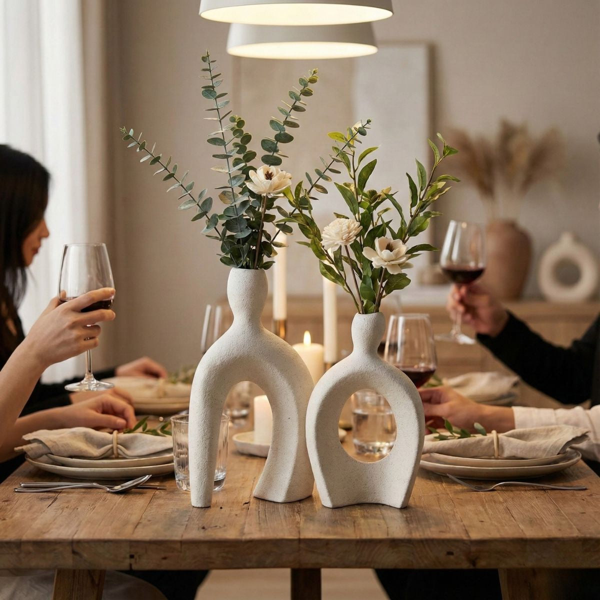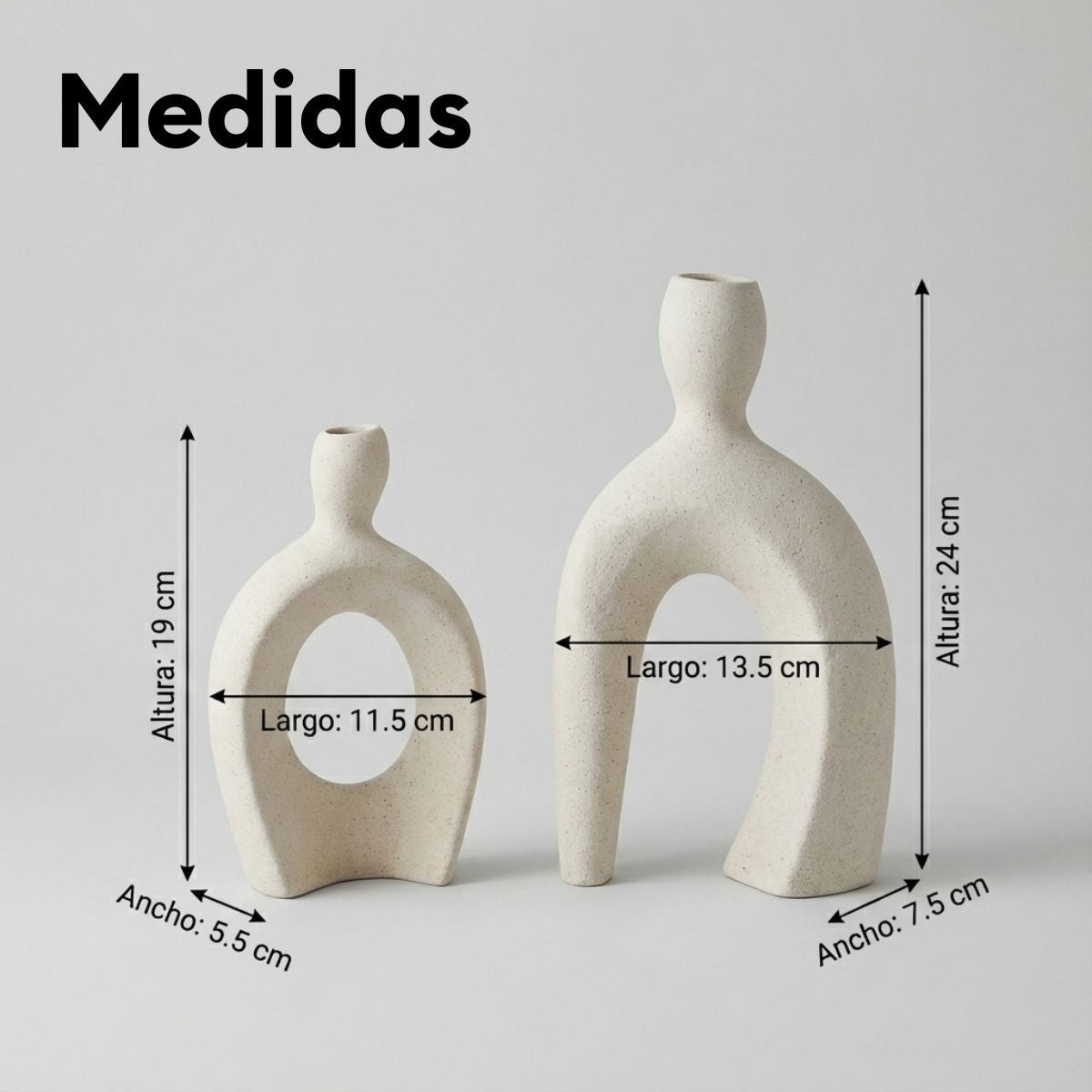 Aporta calma, estilo y elegancia a tus espacios con este juego de jarrones decorativos de inspiración nórdica. Su diseño minimalista de líneas curvas y cuerpo hueco crea un efecto visual moderno y sofisticado que realza cualquier ambiente sin sobrecargarlo.