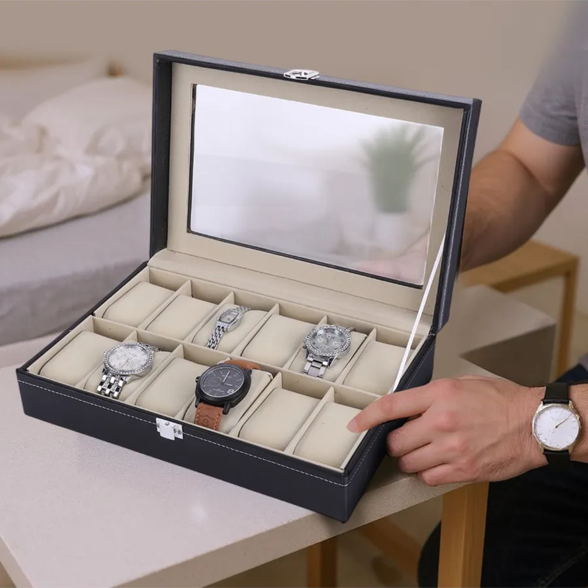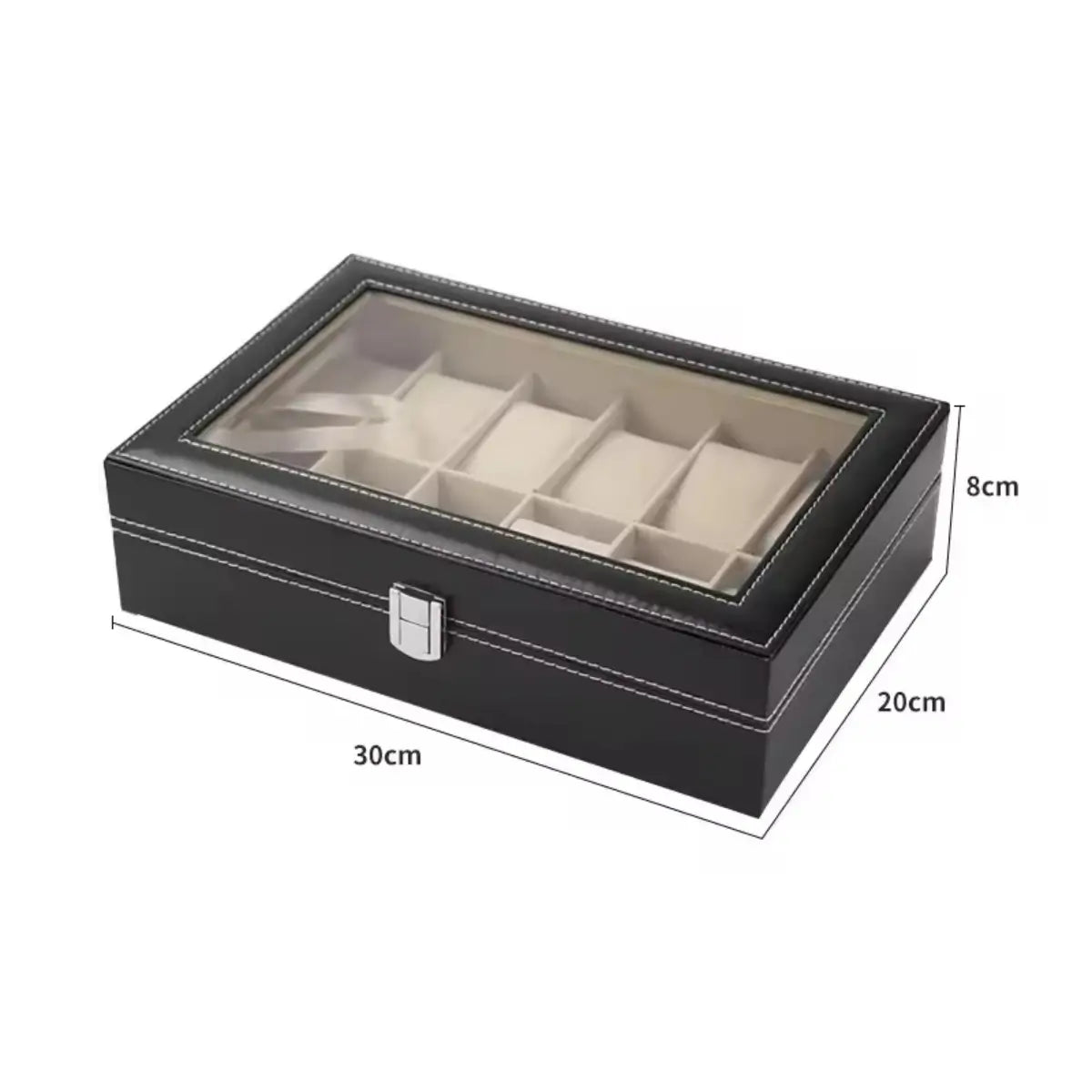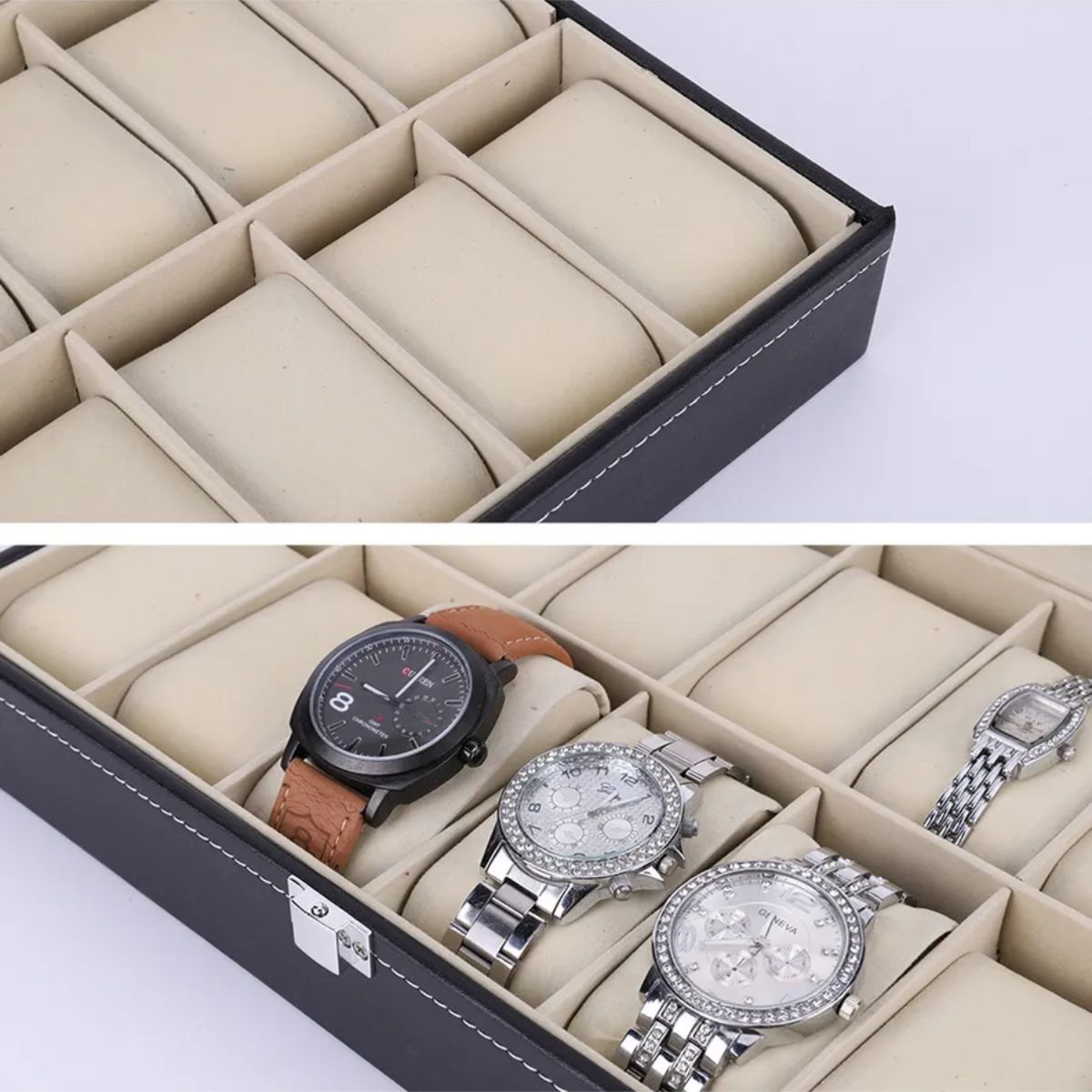 Organiza tus relojes y accesorios con estilo gracias a este porta relojes de 12 divisiones, diseñado para quienes buscan elegancia, orden y protección en un solo producto. Su exterior de cuero sintético de alta calidad ofrece un acabado cómodo y resistente, mientras que el interior de terciopelo suave cuida cada pieza evitando rayaduras, polvo y desgaste.
