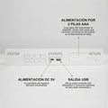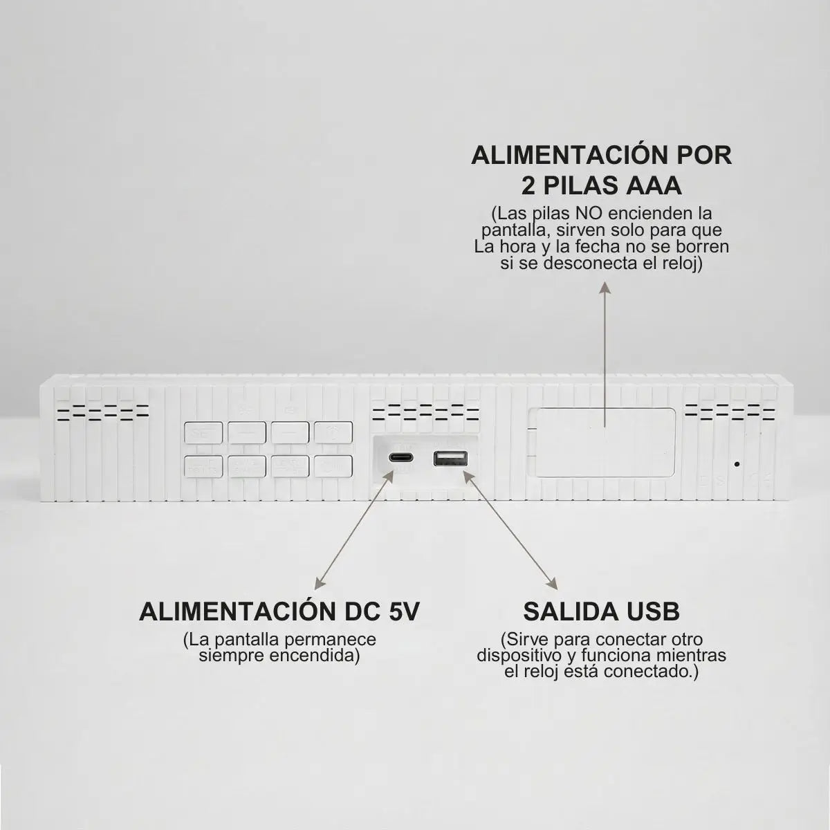 - Pilas AAA (solo guarda hora y fecha, no enciende pantalla) - Salida USB para cargar dispositivos mientras el reloj está conectado