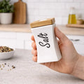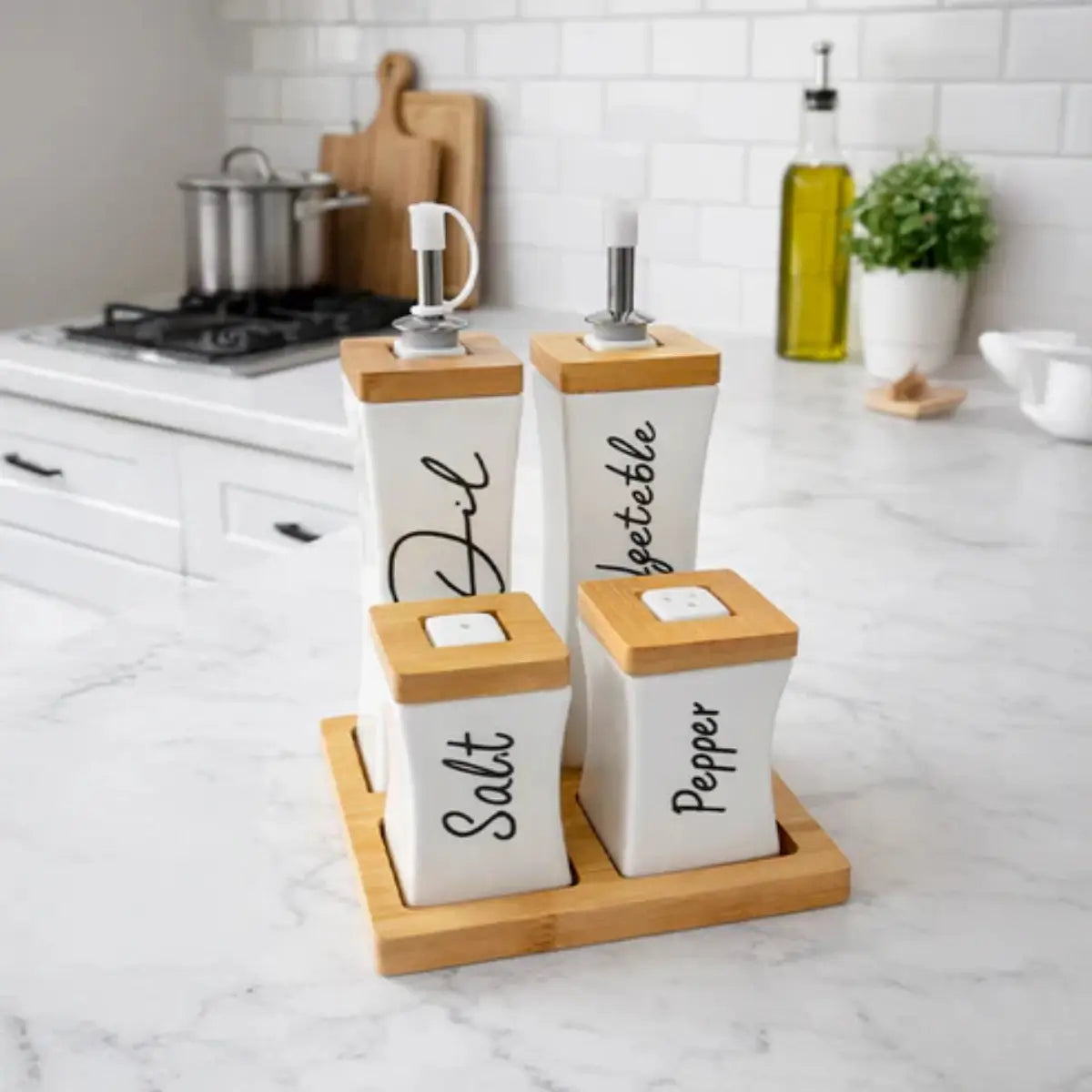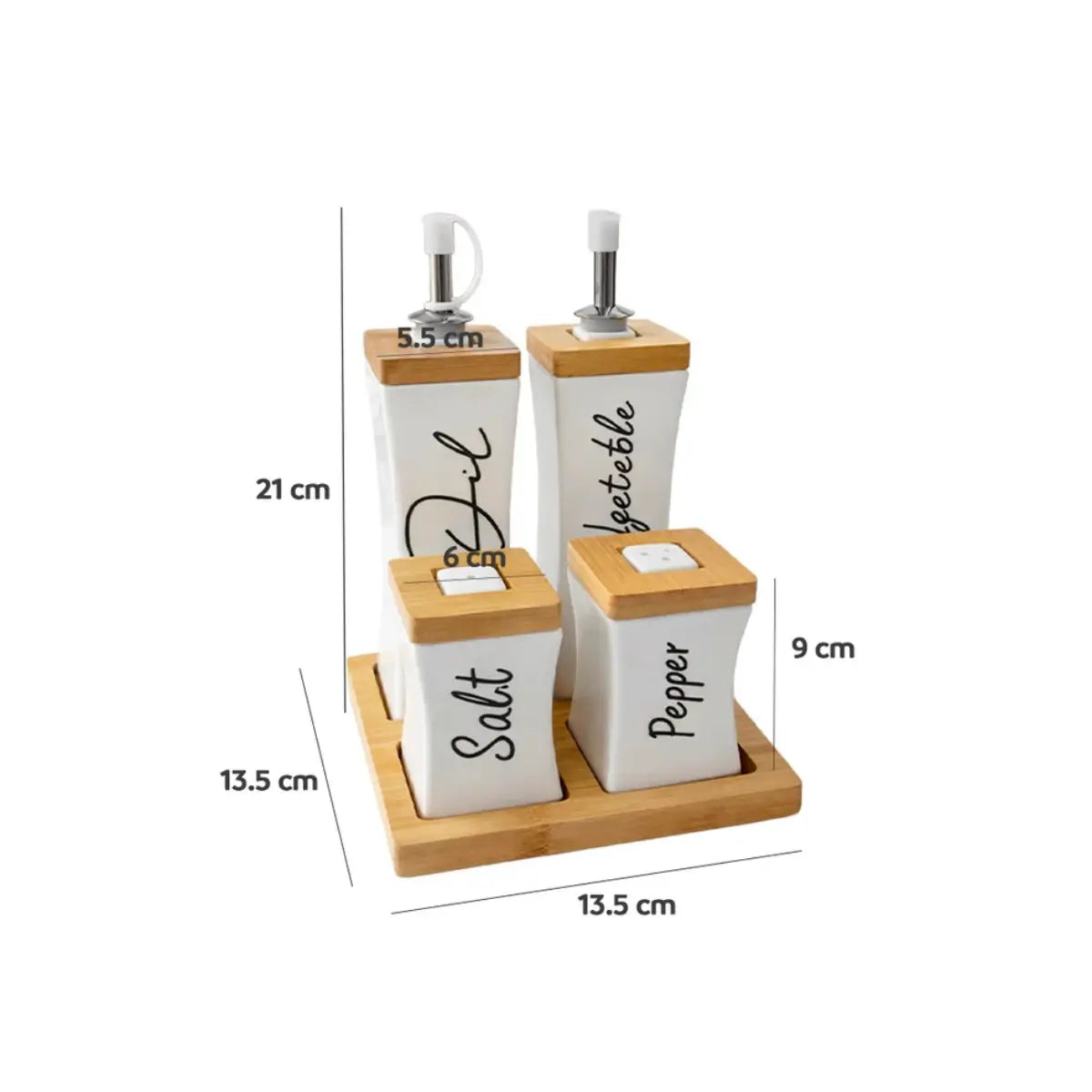 Solución práctica para mantener aceite, vinagre, sal y pimienta organizados en la cocina o en la mesa. Su combinación de recipientes de cerámica con base de bambú crea un conjunto funcional que aporta orden y un estilo natural al espacio.