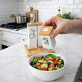 El set incluye dos botellas con dosificador para líquidos y dos frascos para condimentos secos. Su base organizadora mantiene cada pieza en su lugar, facilitando el uso diario y manteniendo los ingredientes siempre al alcance.